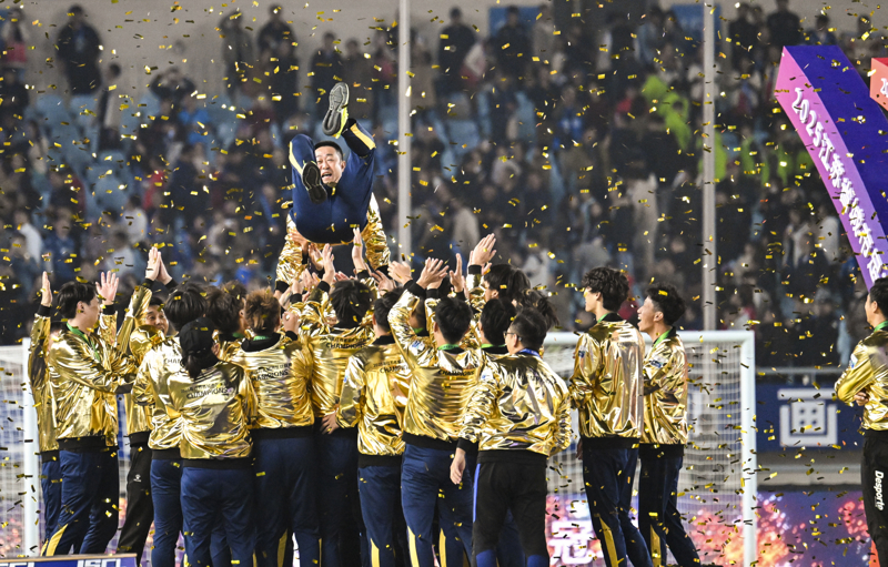 11月1日,冠军泰州队在颁奖仪式上庆祝。 当日,在江苏南京举行的2025江苏省城市足球联赛(“苏超”)决赛中,南通队与泰州队在常规时间0比0战平,通过点球大战,泰州队总比分4比3战胜南通队,夺得冠军。\n 新华社发